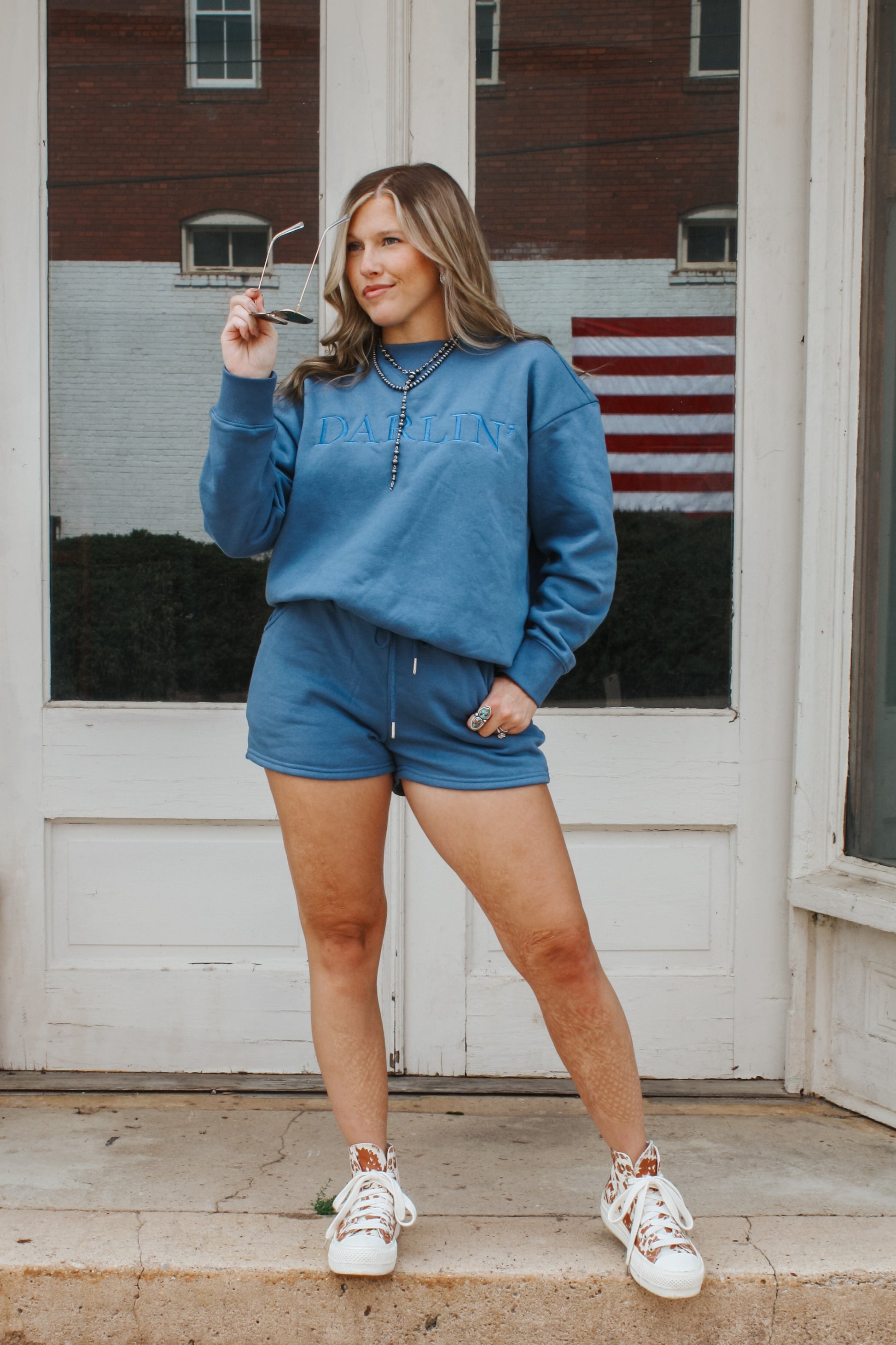 Stay cozy and stylish this fall with the Darlin' Sweatshirt Set in denim blue. This comfortable set includes a soft sweatshirt paired with matching shorts, perfect for layering on cooler days. Its versatile color and casual fit make it an essential addition to your seasonal wardrobe.