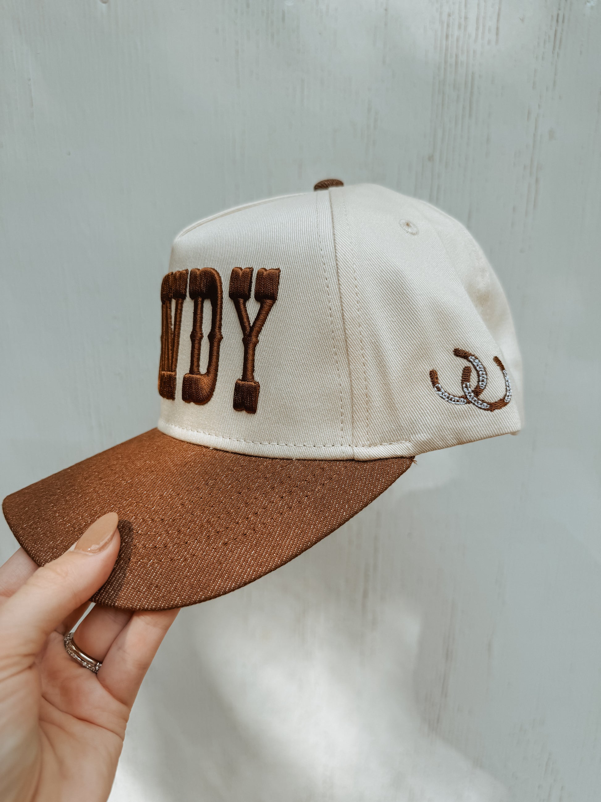 This natural and brown denim trucker hat features 3D embroidery with a horseshoe design, making it a perfect essential for fall.